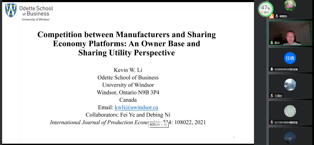 11月10日上午,“商学大讲堂”系列学术讲座第191讲在腾讯会议线上举行。加拿大温莎大学李武教授作为主讲嘉宾进行题为“Competition between Manufacturers and Sharing Economy Platforms: An Owner Base and Sharing Utility Perspective”的学术讲座。本次讲座由诸侯快讯ok1122登录入口副院长王育红教授主持,诸侯快讯ok1122登录入口教师、各专业研究生200余人参与了本次讲座。