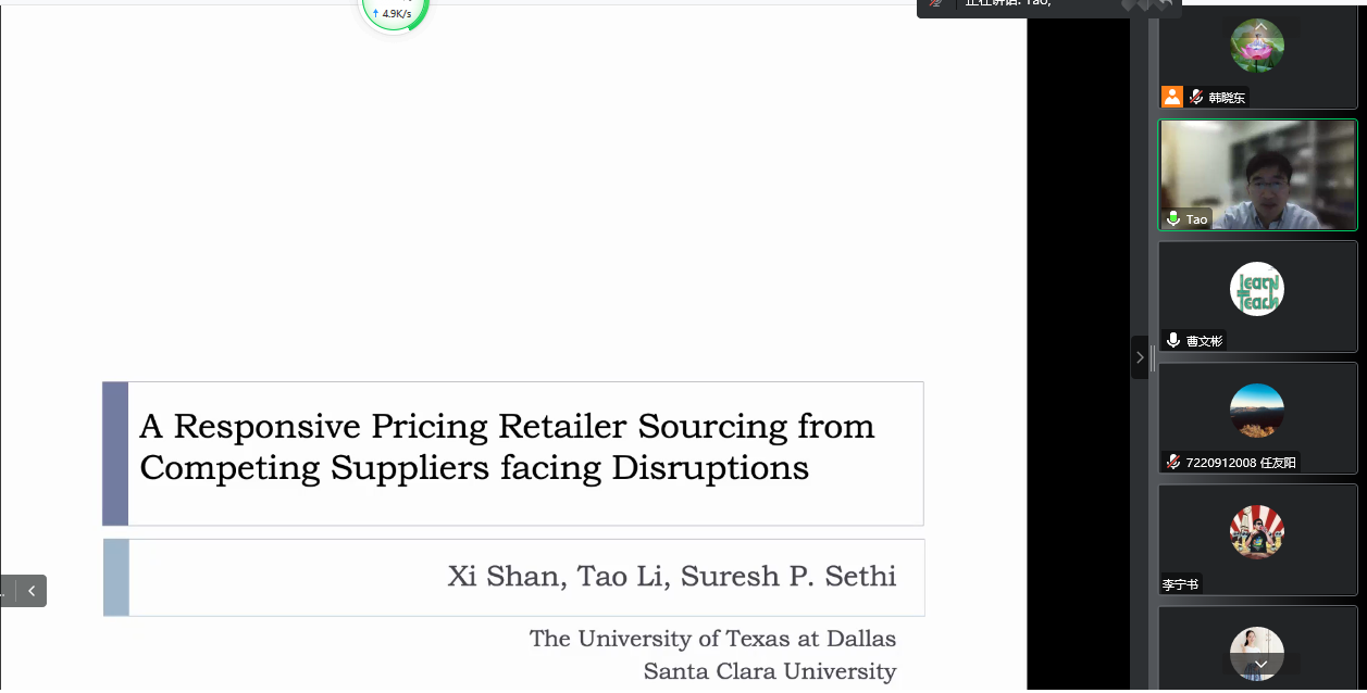 9月22日上午,“商学大讲堂”系列学术讲座第187讲在腾讯会议线上举行。圣克拉拉大学莱维诸侯快讯ok1122登录入口李涛副教授作为主讲嘉宾进行题为“响应式定价的零售商从多个具有竞争性供应商处采购的供应链管理问题”的学术讲座。本次讲座由诸侯快讯ok1122登录入口管理科学与工程系主任曹文彬副教授主持,诸侯快讯ok1122登录入口教师和各专业研究生100余人参加了本次学术交流。