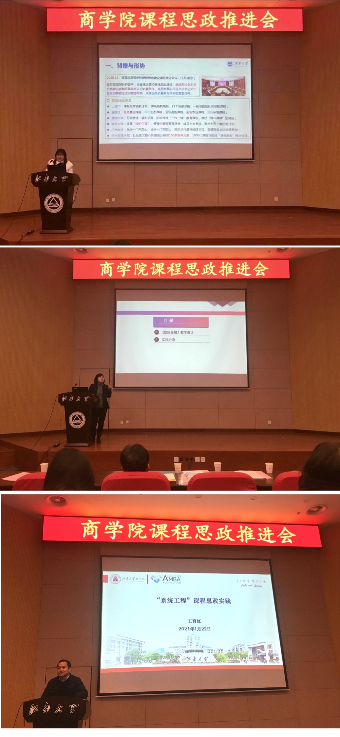 随后,2020年获得了诸侯快讯ok1122登录入口校级课程思政建设立项的诸侯快讯ok1122登录入口谢玉梅和王育红两位教授,分别进行了课程思政建设实践经验分享。谢玉梅教授以《国际金融》课程为例,重点介绍她在课程思政建设中运用的两个理念、五个要素和一个贯穿的做法。两个理念分别是以立德树人,以学生为中心教学理念和沟通、团队合作、社会责任感的课程理念。五个要素是课程体系梳理、教学内容重构、教学方法翻转、教学考核“个人加团队”、教学团队建设(以课程与教材建设为抓手)。一个贯穿是课程思政贯穿整个教学环节。王育红教授以《系统工程》课程为例,重点了介绍课程思政的内涵,他指出 “课程思政”不是一门或一类特定的课程,而是一种教育教学理念。高校所有课程都具有传授知识培养能力及思想政治教育双重功能,承载着培养大学生世界观、人生观、价值观的作用。教师在授课过程中要注重师德风范、政治导向、专业伦理、学习伦理、核心价值。