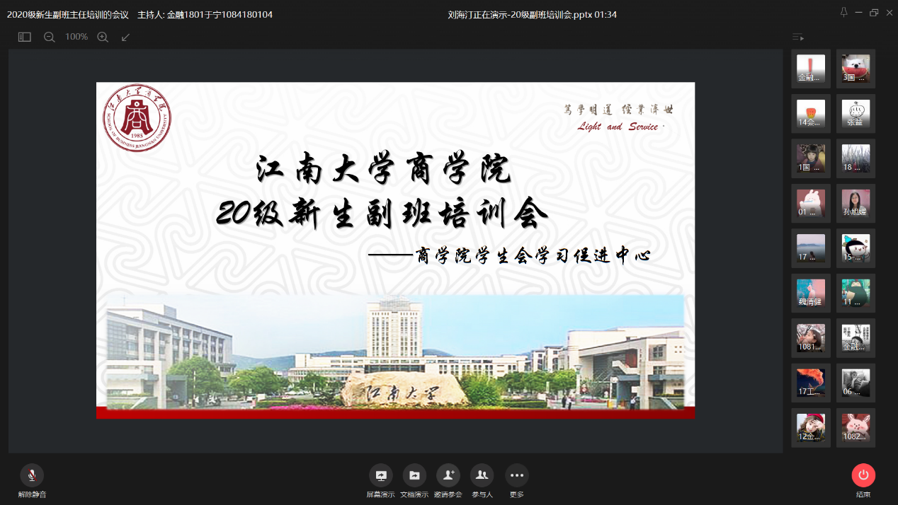 7月17日下午,诸侯快讯ok1122登录入口2020级新生副班主任线上培训会顺利举行。分管学风建设辅导员孙旭媛,2020级新生辅导员石可婧、呼酩杰,2019级优秀副班代表,以及全体2020级副班主任参加会议。五位2019级优秀副班代表分别结合各自专业从“忆昔抚今,不忘初心”、“新生开学前后准备”、“副班工作经历与心得”、“学风建设”、“积极联系班主任与班团学”等五个不同的角度,结合自身经历进行了分享。