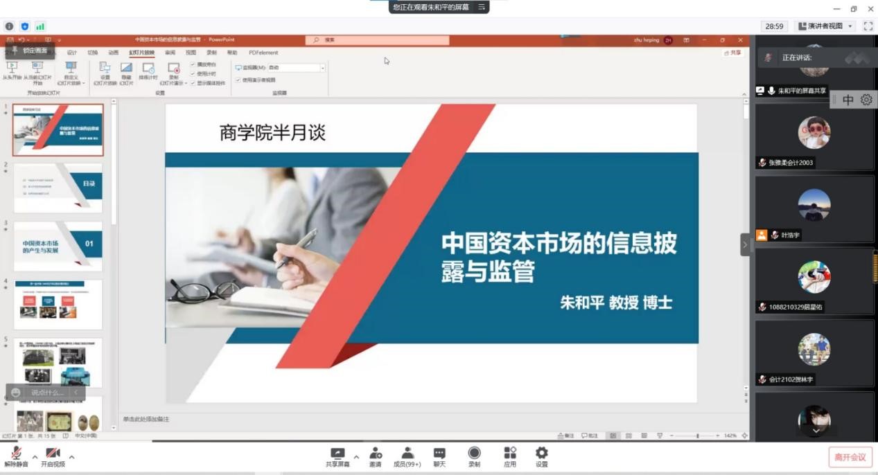 4月22日下午,诸侯快讯ok1122登录入口第155期“半月坛”系列讲座通过腾讯会议平台在线举行。诸侯快讯ok1122登录入口会计学专业教授朱和平作为主讲嘉宾,为诸侯快讯官网150余名本科生做了题为“中国资本市场的信息披露与监管”的专题讲座。