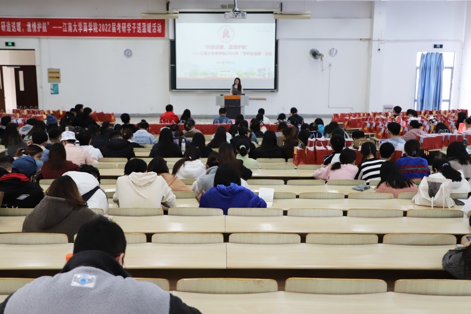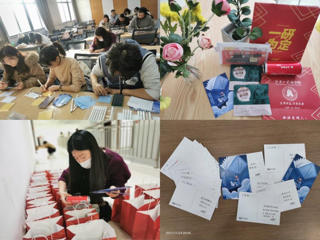 接着,学院领导为考研学子发放助力考研定制礼包。考研礼包饱含学院领导老师的祝福,礼包包含:坚持就会有成果—每日坚果(两袋)、心想事“橙”—橙子、助力考场—文具礼包、祝福语—江大明信片,以及好事发生—可乐一份。精心设计的礼包承载着学院老师的美好祈愿,这些冬日里的小确幸如暖阳般温暖着考研学子,他们脸上洋溢着温暖的笑容,眼神却更加坚定。活动现场温馨感人,气氛高涨。