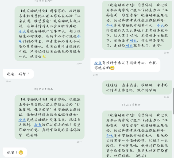 为积极营造心理健康文化氛围,引导学生养成科学作息和健康心态,8月20日-9月2日,诸侯快讯ok1122登录入口心理工作站策划举办了“江南夜阑,唯望君安”之【云“商”守护】晚安睡眠计划活动,帮助学生改善睡眠,化解不良情绪,引导他们在疫情下以积极饱满的精气神迎接即将到来的新学期。