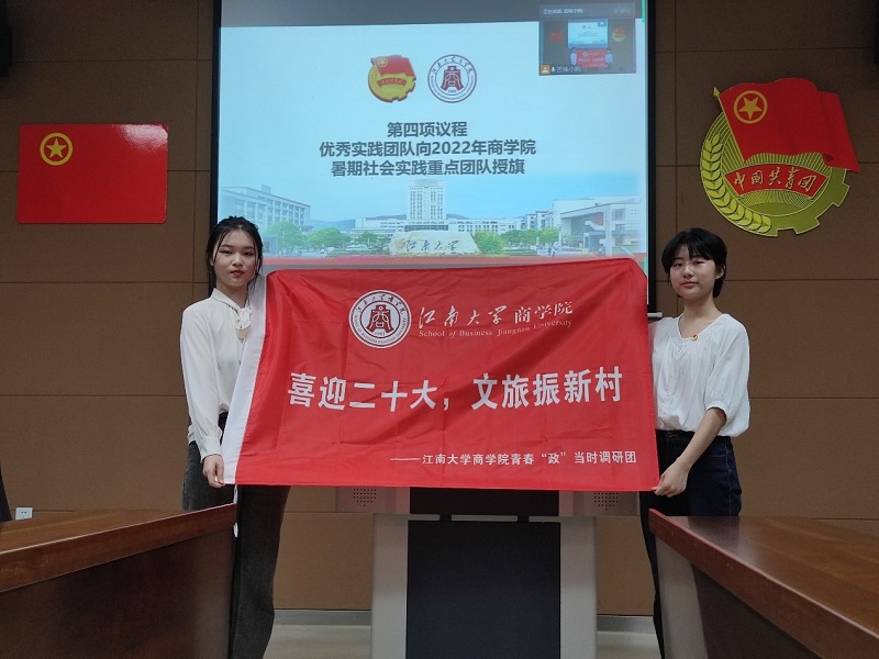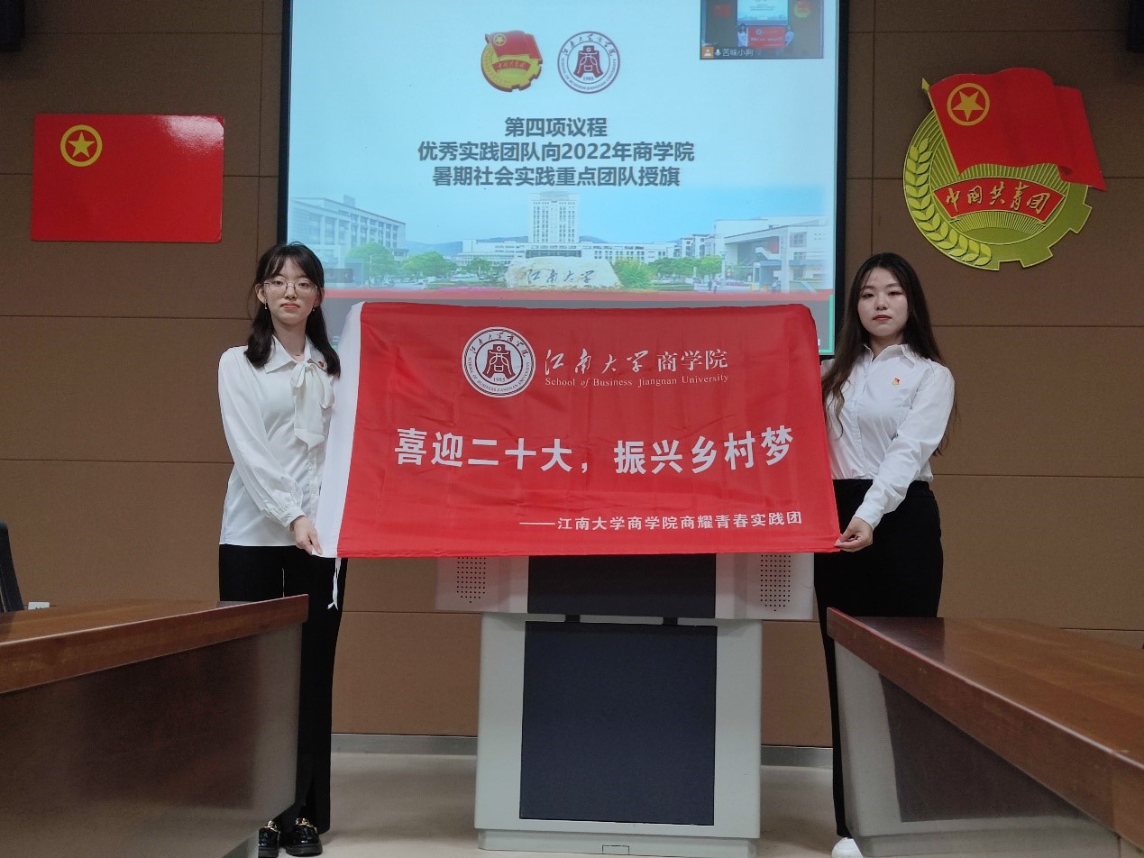 优秀实践团队向“商耀青春实践团”授旗