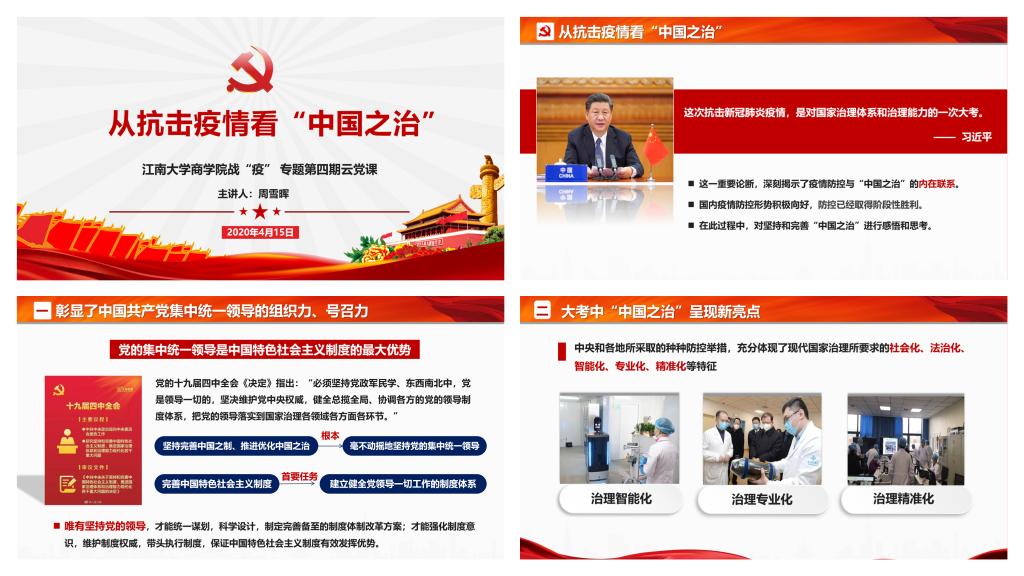 党的十九届四中全会后,广大党员干部和群众积极主动接受了国家制度和国家治理的宣传教育。周雪晖老师认为,学生党员应自觉领悟习近平总书记强调的底线思维、增强忧患意识、防范风险挑战。新时期新青年要正视暴露出的短板弱项,总结经验汲取教训,在疫情大考中淬炼“中国之治”;把准推进“中国之治”的着力点和努力方向,努力将国家制度优势更好地转化为国家治理效能。党课最后,周雪晖老师以两道课后思考题收束此次云党课:“西方国家面对中国成熟的防疫经验,为什么不‘抄作业’?”“为什么西方媒体双标抹黑中国?”,并对商院学生党员定能答好思考题充满信心。