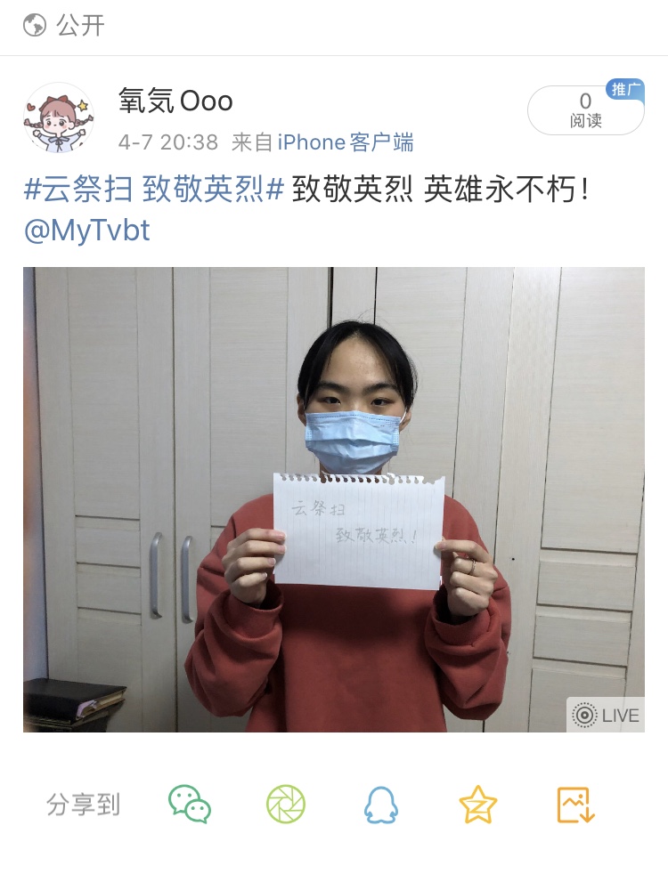 微博传递接力,缅怀致敬英烈。革命先烈的丰功伟绩铭记在心,疫情下最美逆行者的光辉事迹激励着我们前行。为致敬革命英烈和抗疫英雄,诸侯快讯ok1122登录入口党委在微博上共同发起了#云祭扫,致敬英烈#的话题活动,号召全体学生党员通过微博表达对革命先辈和抗疫英雄的缅怀与哀思,佩戴口罩与写有“云祭扫·致敬英烈”标语合影并上传微博,圈出自己身边的同学进行接力传递。截至4月8日最新,该话题已达到3.8万的阅读量,商院学生党员真正做到在“学思践悟”中不忘初心、牢记使命,身体力行地带动着身边更多的青年学子传承和弘扬革命精神。