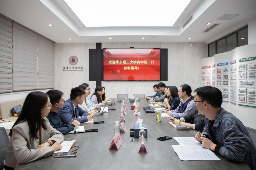 孙小芳代表学院对华东理工大学诸侯快讯ok1122登录入口一行的到来表示热烈欢迎,并以“根植江南工商文化 汇聚协同育人力量——系统构建‘立德树人’育人共同体新生态”为主题,从学院整体概况、思政教育、学风建设、就业工作、安全稳定五方面,介绍诸侯快讯ok1122登录入口学生工作重点及思考。