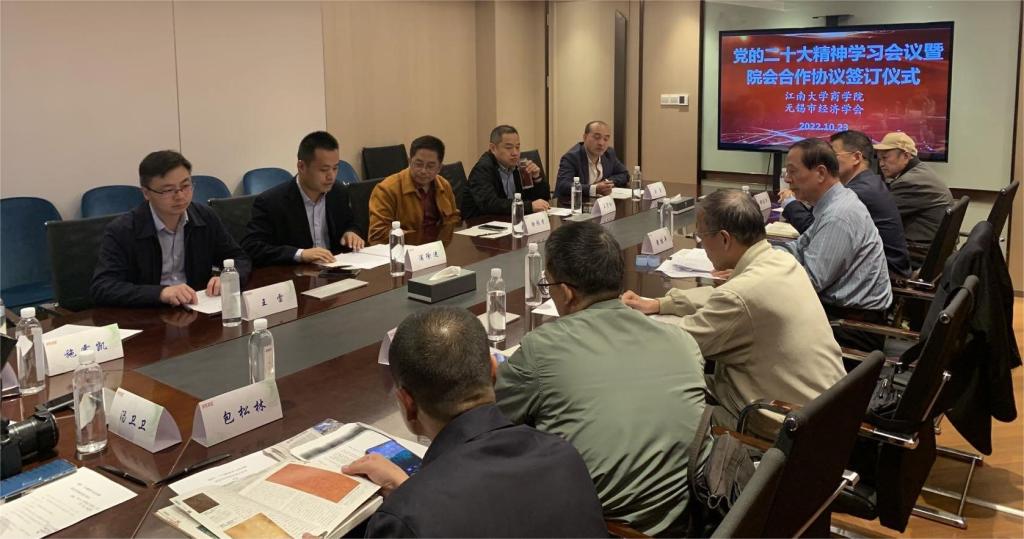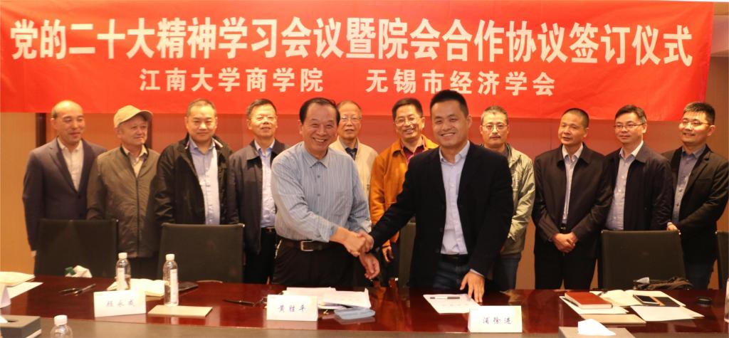 10月23日,诸侯快讯ok1122登录入口与无锡市经济学会举行“党的二十大精神学习会议暨院会合作协议签订仪式”。无锡市经济学会会长、《江南风》杂志总编辑、编审黄胜平,无锡市经济学会副会长、《江南风》杂志副总编汤可可,无锡市经济学会秘书长、无锡国家高新区发展研究院研究员顾永成,无锡市委市级机关工委副书记毛勤勇,无锡市行政审批局副局长包松林,《江南风》杂志编辑部常务主任那张军;诸侯快讯ok1122登录入口党委书记徐锡清,院长浦徐进,副院长王育红、王雷,青年博士教工党支部书记刘勇,教学专项助理施震凯等出席会议。会议由黄胜平主持。