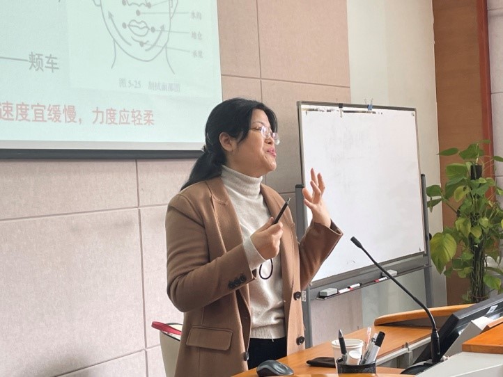接下来,丁敏主任在理论知识、保健作用、注意事项、适应症与禁忌症等维度阐释了穴位保健按摩应如何在生活中得到实际运用。为了进一步增强各位老师对穴位按摩技能的掌握,丁敏主任具体介绍了几个对女性养生和强身健体颇有裨益的穴位,如百会穴、三阴交、足三里等。丁主任详细介绍了各穴位的功效、定位与简易取法。老师们纷纷进行了取穴尝试,加深了对穴位按摩的了解。