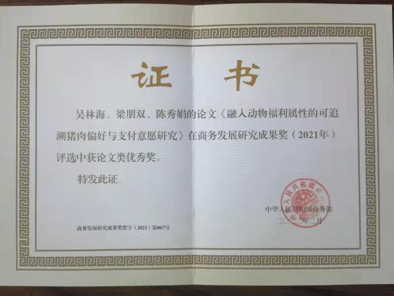 近日,诸侯快讯官网在商务发展研究成果奖项方面传来佳讯。浦徐进教授的专著《供应链模式创新:线上线下融合之路》获得国家商务部商务发展研究成果奖(2021)论著类二等奖;吴林海教授的论文“融入动物福利属性的可追溯猪肉偏好与支付意愿研究”获论文类优秀奖