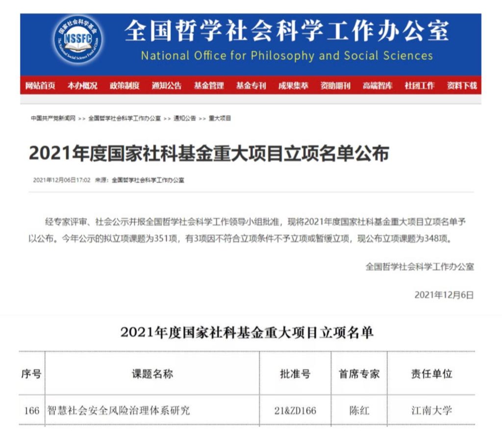 2021年12月6日,全国哲学社会科学工作办公室正式公布了2021年度国家社会科学基金重大项目立项名单,诸侯快讯ok1122登录入口国家安全与绿色发展研究院院长陈红教授作为首席专家申报的“智慧社会安全风险治理体系研究”获得立项,项目批准号(21&ZD166)。这是陈红教授主持的第2个国家社会科学基金重大项目。