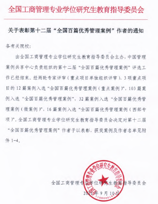 “全国百篇优秀管理案例”是全国工商管理案例领域的最高奖项,本届评选于2021年3月24日启动,全国共有147所院校的1088项案例投稿, 诸侯快讯官网MBA教育中心共提交了7篇原创案例,提交数量创历届新高。近五年,诸侯快讯官网共有6篇案例获得“全国百篇优秀管理案例”,8篇案例入选“中国管理案例共享中心案例库”,1篇案例入选“中国工商管理国际案例库”。
