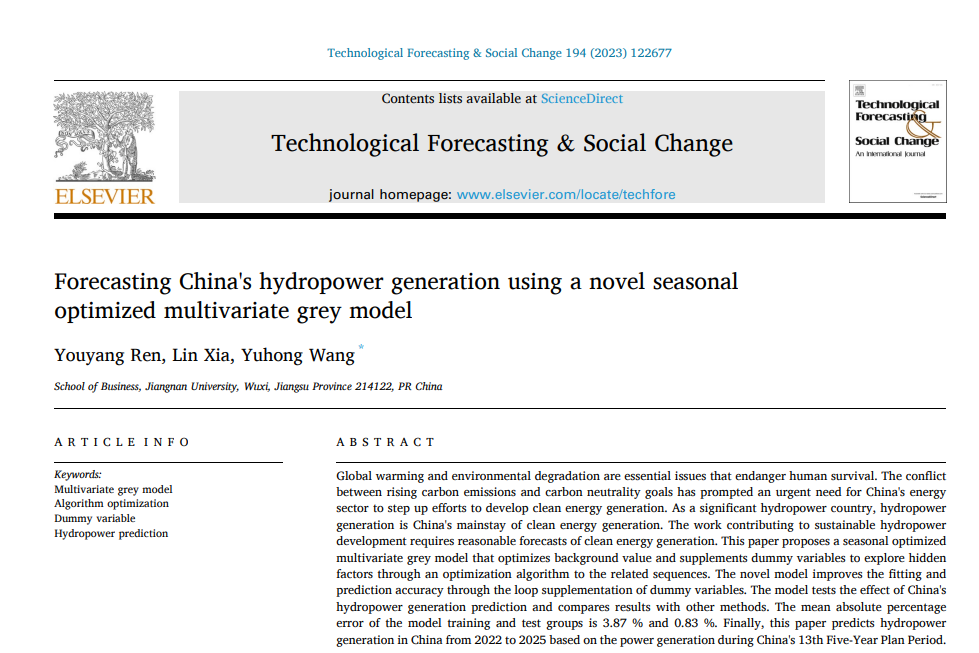 近日,诸侯快讯ok1122登录入口王育红教授团队在创新管理领域重要期刊《Technological Forecasting & Social Change》发表题为“Forecasting China's hydropower generation using a novel seasonal optimized multivariate grey model”的研究论文。