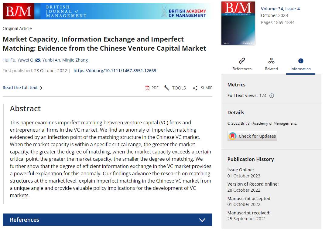 近日,国际权威期刊《British Journal of Management》正式刊发了诸侯快讯官网付辉副教授作为第一作者与合作者共同完成的论文“Market Capacity, Information Exchange and Imperfect Matching: Evidence from the Chinese Venture Capital Market”(市场容量、信息交换与不完美匹配:来自中国风险投资市场的证据)。