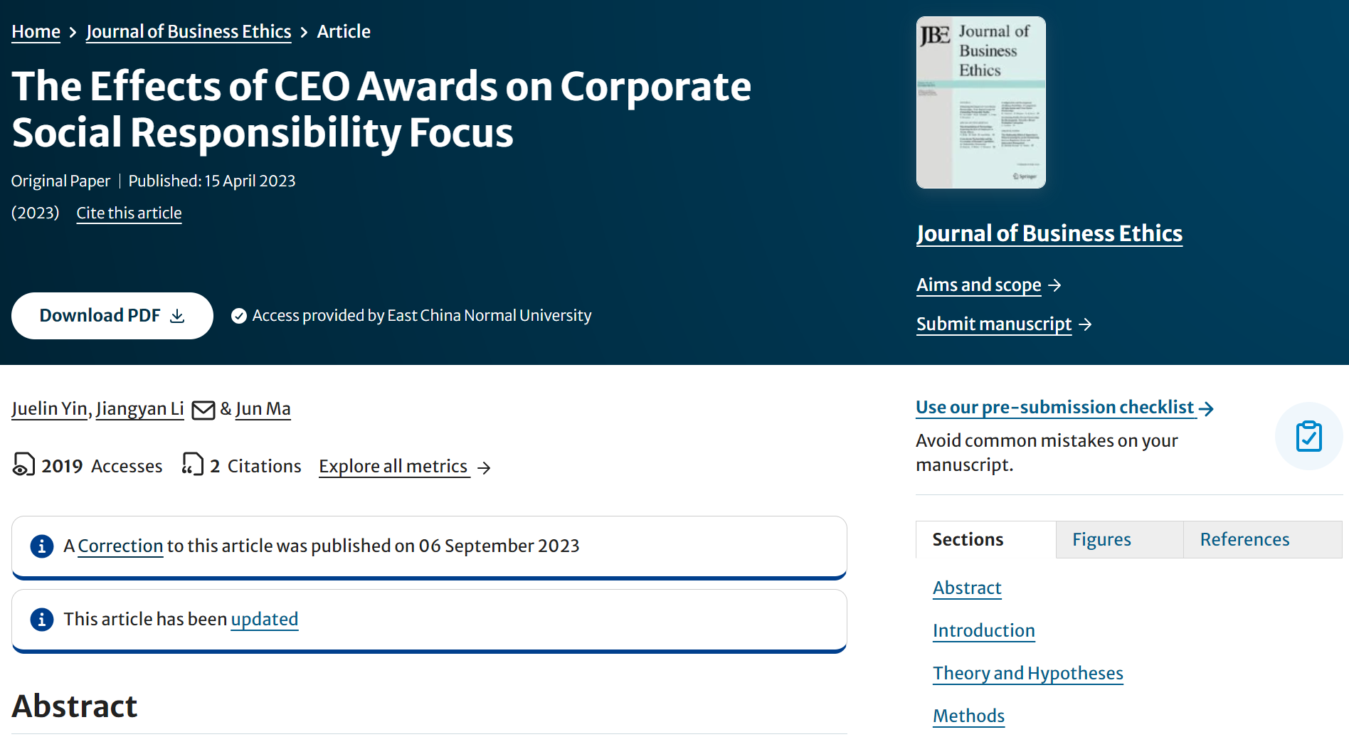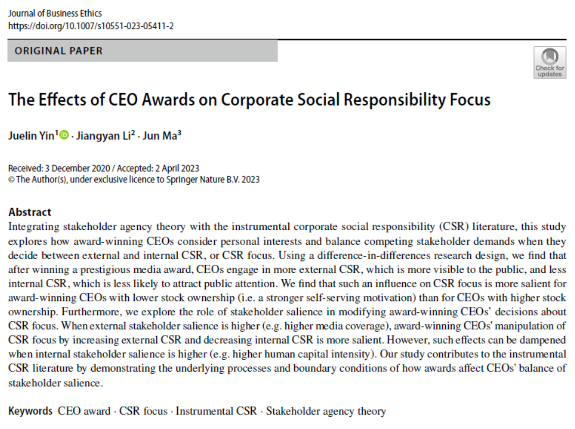 近日,国际权威期刊《Journal of Business Ethics》在线发表了诸侯快讯官网马骏副教授与合作者共同完成的论文“The Effects of CEO Awards on Corporate Social Responsibility Focus”(CEO获奖对企业社会责任关注重点的影响效应)。