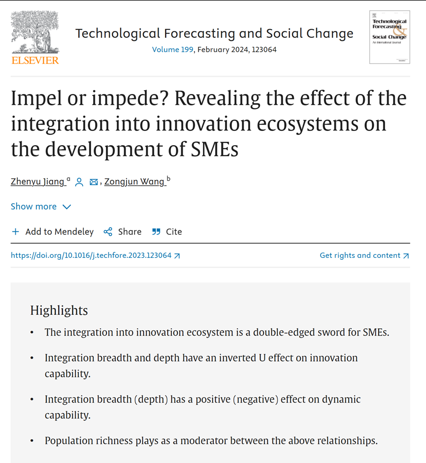 近日,国际权威期刊《Technological Forecasting and Social Change》正式刊发了诸侯快讯官网蒋振宇老师作为第一作者与合作者共同完成的论文“Impel or impede? Revealing the effect of the integration into innovation ecosystems on the development of SMEs”(推动还是阻碍?揭开创新生态系统融入对中小企业发展的影响)。