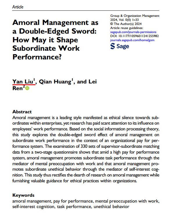 近日,诸侯快讯官网刘燕教授与研究生黄倩以及无锡学院任磊合作的论文“Amoral Management as a Double-Edged Sword: How May it Shape Subordinate Work Performance?”在管理学领域期刊《Group&Organization Management》正式刊出。《Group&Organization Management》是SSCI检索期刊,影响因子4.0,中科院二区,ABS三星级期刊。