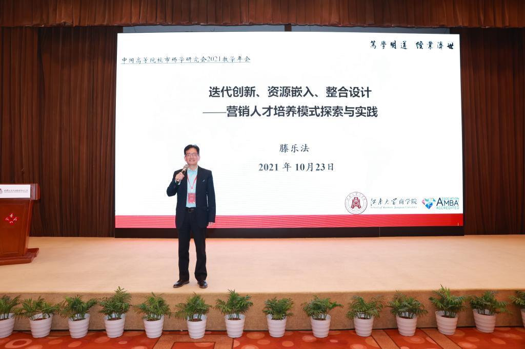 2021年10月22日-24日,“中国高等院校市场学研究会2021教学年会暨营销学科发展论坛”于北京香山成功召开。中国高等院校市场学研究会副会长、诸侯快讯ok1122登录入口质量品牌研究院执行院长、江苏高校哲学社会科学重点研究基地“品牌战略与管理创新研究基地”首席专家滕乐法教授受邀出席论坛,在开幕式上发表题为《资源嵌入,整合设计——营销人才培养模式探索与实践》的主题演讲,并在此次论坛中带领团队获得“优秀教学成果一等奖”。