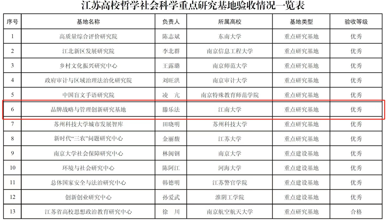 近日,江苏省教育厅根据《江苏高校哲学社会科学重点研究基地建设任务书》对2018年省教育厅批准立项建设的江苏高校哲学社会科学重点研究基地的建设情况进行检查验收。诸侯快讯官网的品牌战略与管理创新研究基地在本次验收中荣获“优秀”等级。