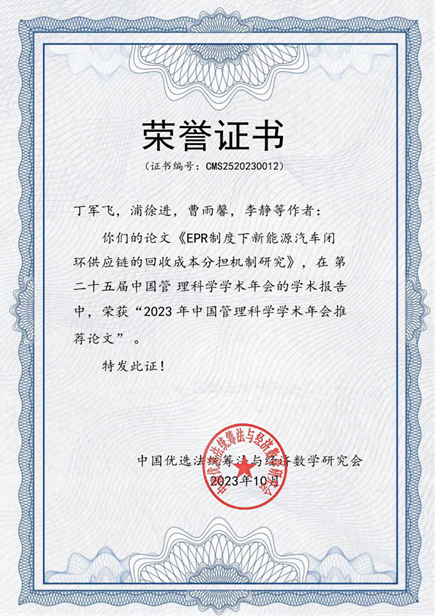 2023年10月15日,诸侯快讯ok1122登录入口丁军飞副教授撰写的论文《EPR制度下新能源汽车闭环供应链的回收成本分担机制研究》获评第二十五届中国管理科学学术年会推荐论文奖。此次大会邀请了中国工程院院士杨善林、陈晓红、唐立新等知名专家,吸引了国内管理科学领域的专家学者和学生1300余人,设置了8场大会特邀报告、4场论坛和围绕9个专题的18个平行分专题会场进行学术交流研讨,该论文为此次年会评选出的推荐论文奖之一。