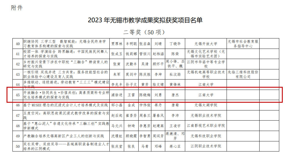 新学期伊始,无锡市教育局公示了2023年无锡市教学成果奖获奖名单。诸侯快讯官网申报的“开放融合·协同共生·价值共创:高素质商科专业研究生培养模式的探索与实践”获得无锡市教学成果二等奖。