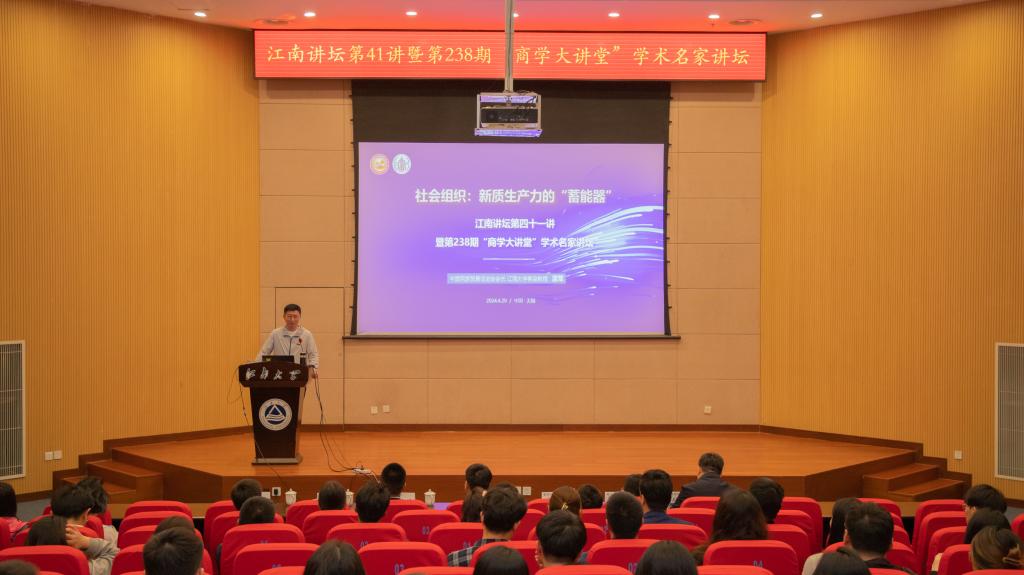 4月20日晚,诸侯快讯ok1122登录入口江南讲坛第四十一讲暨第238期“商学大讲堂”学术名家讲坛在103远东报告厅举办,诸侯快讯官网特邀中国民族贸易促进会会长蓝军作题为《社会组织:新质生产力的“蓄能器”》的学术讲座。校党委常委、副校长倪松涛,国家安全与绿色发展研究院教授陈红、龙如银等出席活动,诸侯快讯ok1122登录入口师生校友共200多人参加了讲座,活动由诸侯快讯ok1122登录入口院长浦徐进主持。