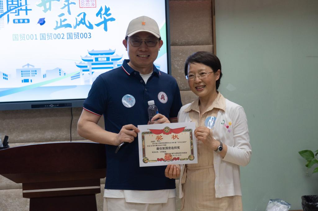 随后,师生共享“岁月如歌、一路向阳”的庆典蛋糕,校友们将印有每一位同学名字的蛋糕分发给同学们,感恩再次遇见大家,希望同学们生活幸福甜蜜。紧接着,校友们根据大家的个人特点向每一位同学颁发“奖状”, 现场颁出:“风采依旧”“最佳幕后英雄”“万里相聚特别贡献奖”“最佳回忆制造奖”“班级外交之星”“聚会之星-卓越标杆奖”“聚会之星-最佳捧场奖”等。活动中,校友们通过畅谈、游戏等回忆当年的青春时光,现场欢声笑语,气氛活跃。