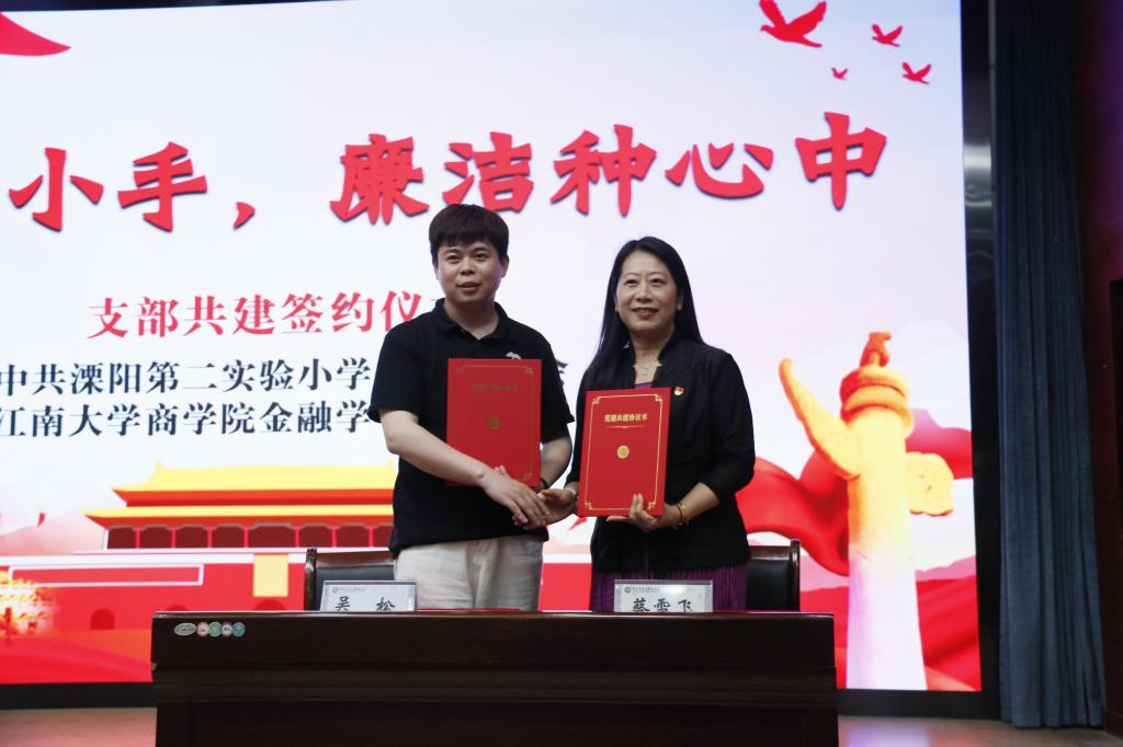 之后,在双方党员的见证下,中共溧阳市第二实验小学支部委员会与中共诸侯快讯ok1122登录入口金融学学生支部委员会开展“大手拉小手,廉洁种心中”的党建联盟签约共建仪式。