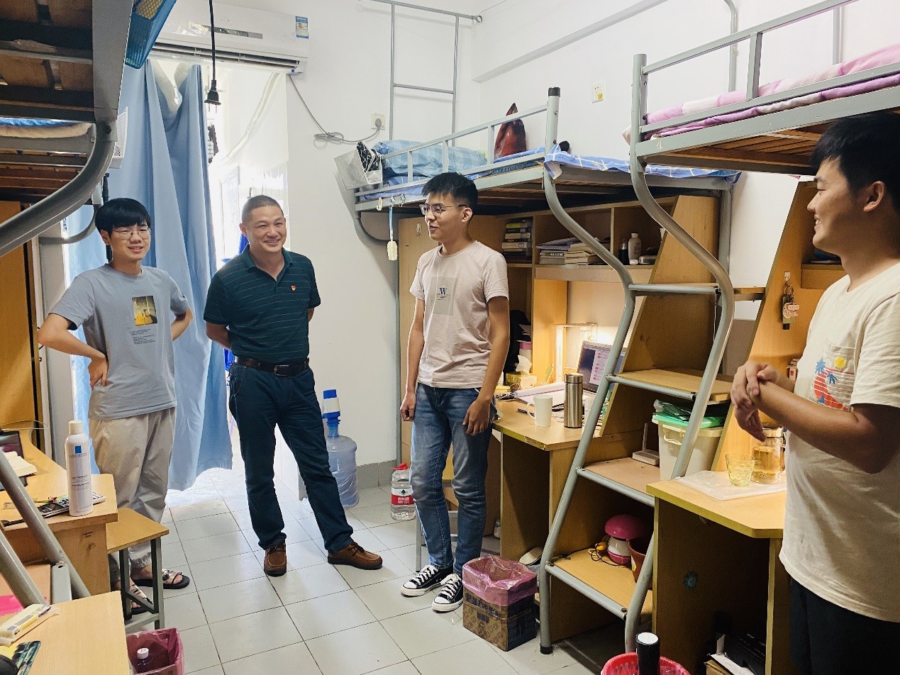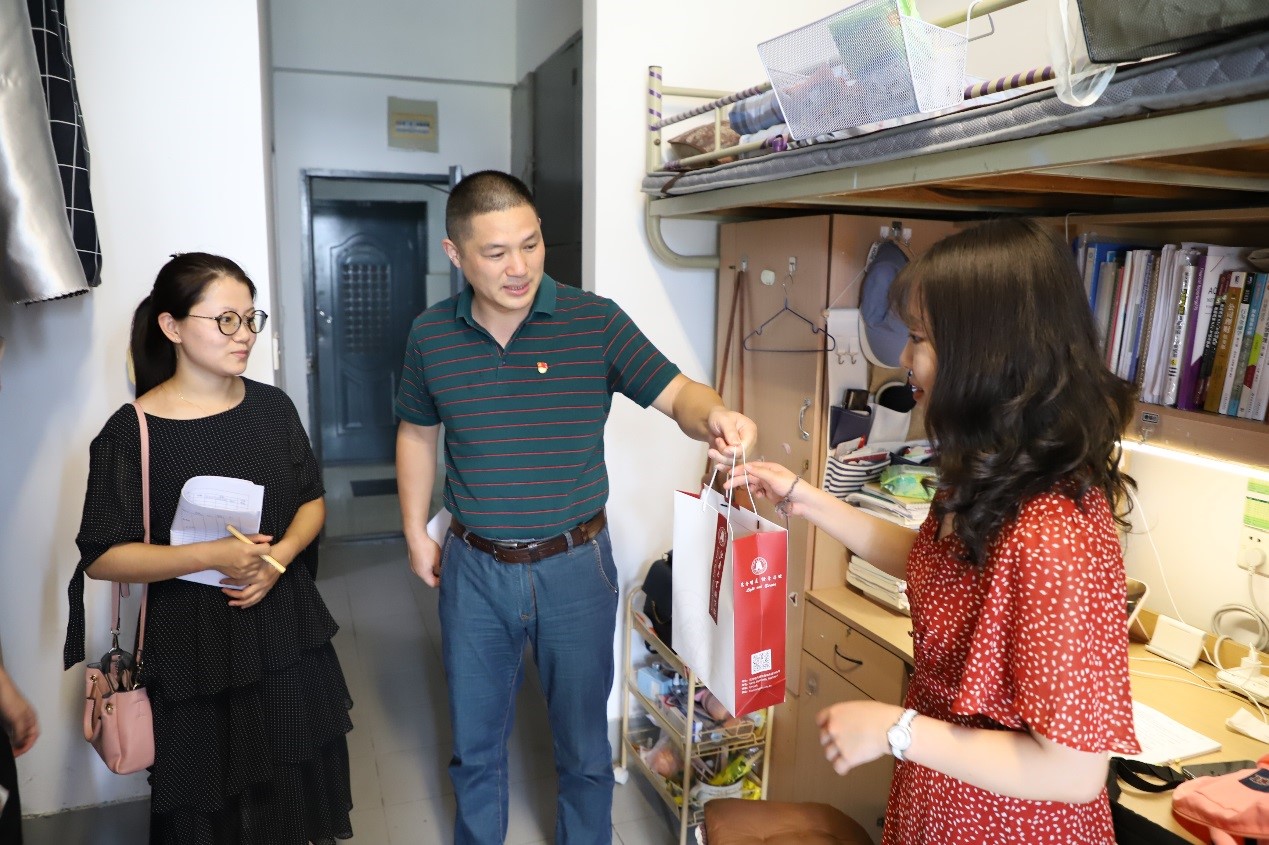“你的家乡是哪里的?”“回到学校吃的住的还习惯吗?”“对学校采取的防控措施都理解吗?”在走访的每个学生宿舍,学院领导老师与学生亲切交谈,详细询问返校过程、居家在线及返校后的学习情况,了解学生宿舍卫生、消毒和通风情况。